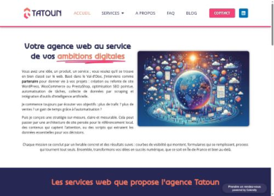 Tatoun est une agence web située dans le Val d’Oise (95), spécialisée dans la création de sites WordPress, WooCommerce et PrestaShop. Nous accompagnon...