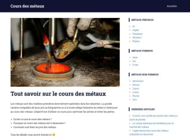 L'Argent, le cuivre, l'or ou encore le zinc sont à l'honneur sur le site coursdesmetaux.net. Venez-y découvrir leurs cours, leurs tendances et leur ac...