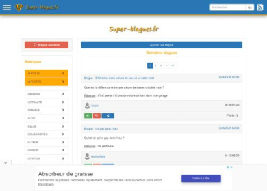 Super-blagues.fr est un site de blagues permettant à un utilisateur de déposer de nombreuses blagues après inscription. Chaque utilisateur peut voter...