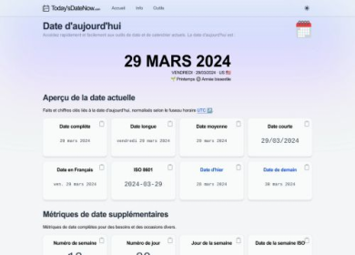 TodaysDateNow.com offre un accès instantané aux informations de date et de calendrier actuelles, présentées de manière conviviale. Le site propose des...