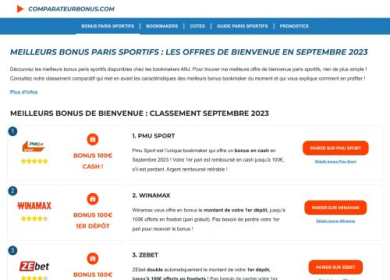 ComparateurBonus.com est le spécialiste en matière de paris sportifs. Vous trouverez l'ensemble des bonus bookmakers disponibles en France (bonus en c...
