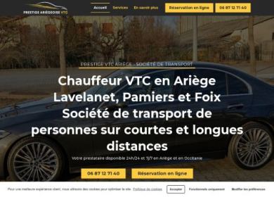 Le site web https://prestigevtc09.fr/ propose des services de VTC (véhicules de transport avec chauffeur) dans plusieurs villes de la région du Ariège...