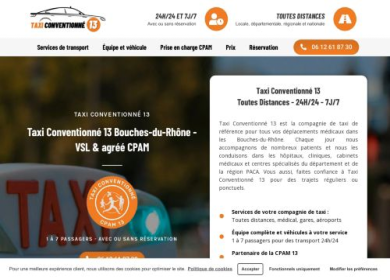 Le site Web de Taxi Conventionné 13 (https://taxiconventionne13.fr/) est un portail en ligne destiné à la réservation de taxis conventionnés pour le t...