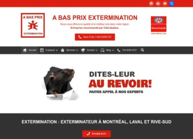 Chez A bas Prix Extermination nous sommes spécialisés dans la gestion parasitaire. Tous nos techniciens sont certifiés pour exécuter tout travail d'extermination. nous n'utilisons que les produits biodégradable et respectueux de l'environnement.Tous nos travaux sont garantis par écrit. Demandez une soumission gratuite dès aujourd'hui afin d'éliminer les parasites nuisibles qui pourraient affecter votre bien-être. tous les employés de notre entreprise un grand soin d'examiner soigneusement l'environnement afin d'y apporter des solutions à long terme à votre problème, de plus ils se feront un plaisir de vous conseiller adéquatement pour que votre problème ne se présente plus.