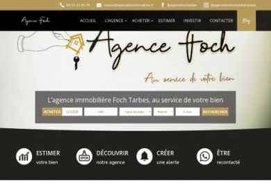 L'agence Foch est une toute nouvelle agence immobilière à Tarbes, située sur l'axe principal commerçant de la préfecture des Hautes-Pyrénées (65), la rue Maréchal Foch. Toute l'équipe de l'agence immobilière vous accueille au sein de locaux flambant neuf, dans un esprit convivial et chaleureux. Ses dirigeants, Émilie et William, la décrivent comme une agence à taille humaine, nouvelle génération, dans laquelle le visiteur et le client se sentent bien, vivent et ressentent une expérience riche, forte et personnalisée. Le slogan de l'agence, “donner du sens à notre métier”, révèle l'éthique qui y règne : les valeurs de solidarité, de professionnalisme, de transparence et de confiance sont de rigueur à l'Agence Foch !