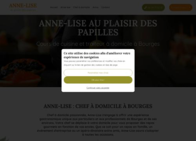 Passionnée de gastronomie, Anne-Lise est une chef à domicile proposant des cours de cuisine et la préparation de repas à domicile que ce soit pour un repas en famille, un événement d'entreprise ou un apéro-dinatoire entre amis, Anne-Lise saura s'adapter à toutes les occasions. Anne Lise peut intervenir sur un rayon de 40 km autour de Bourges.