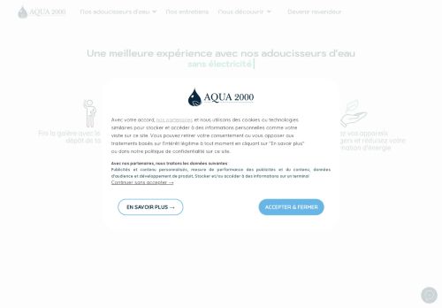 Aqua 2000 est le créateur, le fabricant et l'installateur de ses adoucisseurs d'eau. Ces derniers fonctionnent sans électricité et vous permettent d'avoir une eau claire, saine et pure. L'eau est débarrassée de tous les métaux lourds comme le fer, les nitrates, le calcaire, le chlore etc...La qualité de cette eau vous permet d'avoir une peau et des cheveux tout doux, une vaisselle qui brille à nouveau et bien évidemment une tuyauterie impeccable.