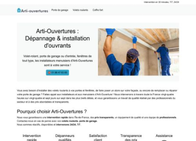 Vous recherchez une enseigne spécialisée dans l'univers des volets roulants et des portes de garage en Île-de-France. Eh bien ! Ne cherchez pas loin, car vous êtes à la meilleure adresse déjà, Arti-Ouvertures. Ayant à son actif une riche expérience de plusieurs années, cette entreprise au savoir-faire reconnu saura répondre à tous vos besoins selon qu'il s'agit de l'installation et du dépannage de volets roulants et de portes de garage. Vous attachez ses services, c'est opter pour des prestations qualitatives, réalisées dans les règles de l'art, et ce, des prix très transparents. Pour plus de détails sur les services de cette entreprise disponible 24 h/24, 7 j/7, l'idéal est de visiter le lien rattaché à cette fiche.