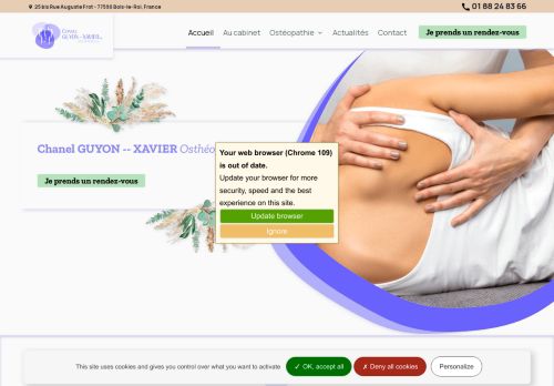 Avez-vous besoin d'un ostéopathe expérimenté et dynamique à Bois-le-Roi (77) ? Si oui, faites appel à Chanel GUYON-XAVIER pour jouir d'une prise en charge rapide et efficace de votre problématique. Avec sa forte expérience de nombreuses années, cette professionnelle dispose de toutes les qualifications requises afin de vous assurer des soins qualitatifs, confortables et sécurisés. Ses prestations restent l'ostéopathie du nourrisson et de l'enfant, de la femme enceinte, des seniors ainsi que du sportif. L'autre point sur lequel il convient de porter l'attention reste le fait qu'elle intervient en cabinet, à domicile et pour des urgences dans les 15 km. Pour plus de détails ou pour la contacter, accédez au lien rattaché à cette fiche.