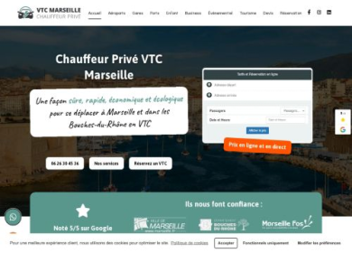 Le site web chauffeurprivevtcmarseille.com est un service de transport de personnes pour les clients à Marseille. Il propose des services de voiture avec chauffeur (VTC) pour les déplacements privés et professionnels, avec des véhicules confortables et fiables. Le site web présente une variété de véhicules disponibles pour les clients, allant des berlines aux minivans, pour répondre à tous les besoins de transport.