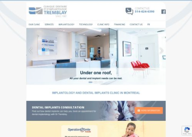 Situé à West Island, un quartier de la ville de Montréal, la clinique dentaire Tremblay propose de nombreuses solutions de traitements dentaires, allant de la simple réparation de caries aux opérations d'implantologies majeures. La clinique est surtout reconnue pour son expertise dans la chirurgie dentaire. De nombreux hygiénistes dentaires transferts leurs patients éprouvant un problème dentaire dramatique à la clinique dentaire Tremblay. Parmi les opérations les plus pratiquées par la clinique, on peut penser à la plastie gingivale, à l'équilibration d'occlusion et à la reconstruction esthétique du sourire.