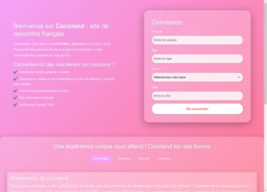 Cocoland est un site de tchat en ligne gratuit, accessible à tous les internautes désireux de discuter sans limites et sans tabous. Que vous souhaitiez faire de nouvelles rencontres, échanger des idées ou simplement passer un bon moment, Cocoland.biz offre une plateforme conviviale et sécurisée pour des interactions en temps réel.