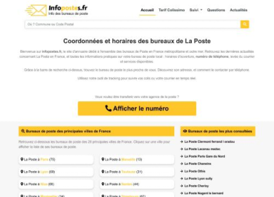 La conception du site infopostes.fr repose sur le principe de mise à disposition des utilisateurs d'un ensemble centralisé d'informations utiles. Les adresses, numéros de téléphone et autres informations de base des 17 000 centres de service à la clientèle de Poste de France sont présentés sur le site Internet au travers de services détaillés pour chaque établissement. De plus, les utilisateurs peuvent suivre Colissimo, Chronopost ou tout coursier avec un numéro de suivi.