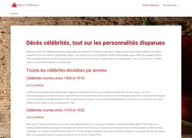 En effet, le site Décès Célébrités est un site d'informations qui vous apporte la lumière sur toutes les personnalités décédées depuis les années 1900 à ce jour. Vous y retrouvez donc, les informations relatives à ces personnalités : de leur date de naissance à celle de leur décès, en passant par leurs œuvres, leur biographie, etc.