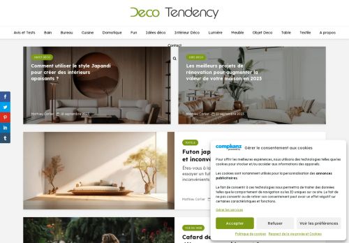 Le blog Deco Tendency présente et décryptes toutes les dernières tendances en matière de décoration et de design. Un vrai concentré d'idées déco pour aménager ou remodeler son intérieur. Le site met un point d'honneur à ne présenter que des produits (meubles, objets déco, diy) qui sont proposés par les marques et les designers à des prix abordables.