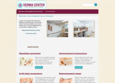 Perdez du poids avec la luxopuncture. Offrez vous des soins amincissants aux huiles essentielles.Une cure effet lifting vous redonnera un visage épanouie et radieux. Des séances de relaxation vous aiderons à évacuer les tensions dues aux rythmes de vie intenses. Stoppez la cigarette en 3 séances qui stimulerons la dopamine, l'endorphine et la sérotonine ce qui vous aidera à passer le cap difficile du sevrage. Derma Center vous propose également un maquillage permanent (réalisé avec des pigments d'origine minérale) et un tatouage réalisés dans le respect des règles d'hygiène et de salubrité.