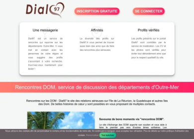 Chatter en direct, faire de belles connaissances, vivre une relation sérieuse et durable. Tout est possible avec «Dial97 ». Le site vous aidera à trouver des personnes sérieuses avec qui discuter et sympathiser ou même aller plus loin si affinités. De nombreux profils de toutes sortes vous attendent sur ce club de rencontre. Le principe est simple, inscrivez-vous, prenez une belle photo, rédigez une annonce, mettez-la en ligne et vous verrez la suite. La majorité des célibataires qui se sont inscrits ont déjà trouvé l'amour. Alors, pourquoi pas vous ?
