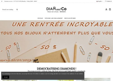 Diam and Co sont des diamantaire et fabricant de bijoux or et diamants. Dans leur boutique en ligne, ils offrent un large choix de bijoux de qualité. Sur leur boutique en ligne, ils offrent une large gamme de bijoux de haute qualité. Il ya aussi des offres spéciales pour les mariages et les engagements ou idées cadeaux avec des prix pas cher mais des bijoux de qualité.