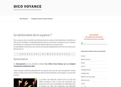 Dico Voyance propose un glossaire des termes des domaines de la voyance, de l'ésotérisme et de la magie blanche. Chaque mot est défini avec des mots simples et clairs et si possible avec des éléments étymologiques.