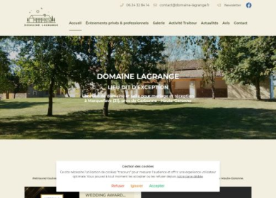 Le Domaine Lagrange, votre domaine à louer près de Carbonne (31), à Marquefave, vous présente son nouveau site internet. Vous y découvrez l'ensemble des services de votre domaine à louer : location de salle de réception pour mariage et réception, location du gîte jusqu'à 32 personnes, services traiteur possible.. Infos, devis et réservation sur le site internet.
