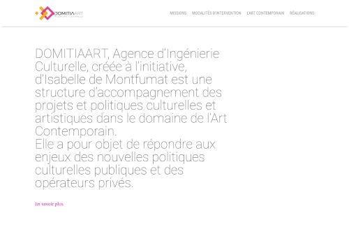 Domitia Art est une agence d'ingénierie culturelle créée par Isabelle de Montfumat, experte dans le domaine de l'Art Contemporain. Avec plus de vingt ans d'expérience, elle œuvre à la réalisation d'expositions pour présenter de grands artistes et faire connaitre les futurs plus grands. Avec des expositions comme Les Champs de la Sculpture, ou l'exposition de Karel Malich, elle montre toute l'étendue de ses compétences pour l'organisation avec la gestion d'œuvres géantes ou très grand format. Après de nombreuses années parisiennes à organiser des expositions nationales et Internationales, elle s'installe à Nîmes pour continuer son Credo et rendre accessible l'Art Contemporain au plus grand nombre et en tous lieux. Sa participation à la dernière exposition des aquarelles de Jean-Louis Pagès sur le mur Norman Foster du Carré d'Art de Nîmes.