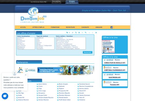 Si vous êtes à la recherche d'un emploi ou en quête de nouveaux collaborateurs en Martinique, à la Réunion, en Nouvelle-Calédonie, à Mayotte, en Guadeloupe ou dans les autres départements et territoires d'Outre-mer, ceci vous intéresse. Dom Tom Job met à votre disposition de nombreux outils pour optimiser votre investigation. Pour les demandeurs d'empli, vous avez, entre d'autres options, la possibilité de lancer votre recherche dès la page d'accueil. Il vous suffit de préciser votre localisation, le type de contrat que vous souhaitez et le métier correspondant à votre profil. Pour les recruteurs, vous avez l'opportunité d'avoir une page réservée à votre activité et les opportunités d'emploi disponibles au sein de votre entreprise.