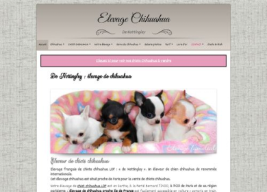 Avant tout, Elevage Chihuahua est le site vitrine de l'élevage de Nottingley. Sandrine est éleveuse de chihuahuas et vous propose de découvrir son univers. Elle décrit avec brio son élevage et les traitements appliqués aux chiots. Vous aurez la possibilité de vous rendre sur-place pour observer les chiens et peut-être choisir le vôtre !