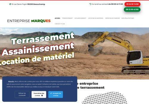 Entreprise Marques est une entreprise de terrassement spécialisée dans le domaine de travaux de terrassement et assainissement sur Beauchamp. En cas de besoin d'avantage d'information concernant nos offres, n'hésitez pas à appeler le numéro 01 34 10 74 50 / 06 13 09 43 80 ou visitez notre site officiel http://terrassement-beauchamp.fr/.