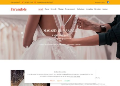 Farandole, votre magasin de mariage à Vendôme (41) dans le Loir-et-Cher, vous présente son nouveau site internet. Vous y découvrez l'ensemble des services et produits de cette boutique de mariage : vente de robes de mariée et robes de soirées, pour tous les budgets, vente de tenues et costumes de soirée et mariage, vente d'accessoires, de matériel de mercerie, couture et du tissus. Bien sûr, vous profitez des conseils de la boutique au quotidien.