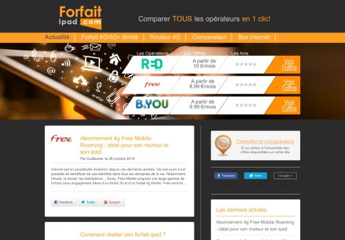 Le site Forfait iPad vous donne la possibilité de faire jouer la concurrence pour trouver l'offre internet qui vous avantage le mieux. Avec ce comparateur, vous pourrez comparer les forfaits internet des opérateurs comme Sosh, SFR, Bouygues Telecom, Orange et Prixtel.