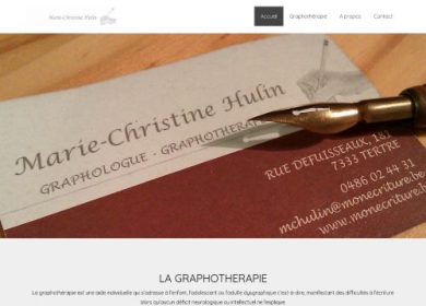 La graphothérapie est une aide individuelle qui s'adresse à la personne manifestant des difficultés à l'écriture. Marie-Christine Hulin, graphothérapeute à Tertre, est active dans la rééducation à l'écriture chez l'enfant, l'adolescent ou l'adulte dysgraphique. Quelques séances suffisent pour percevoir les premiers résultats et pour reprendre confiance en soi et en son écriture.