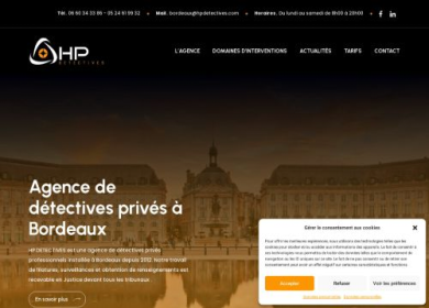 HP Détectives est une agence de détective privé professionnel agréée par le Ministère de l'Intérieur. L'agence est spécialisée dans le traitement des problématiques touchant les particuliers( adultère, garde d'enfants, personnes disparus, héritiers,divorce, conflits familiaux, conflits avec des tiers,...) et les professionnels (actes de concurrence déloyale,vol, arrêts de travail abusifs,...).Basée au coeur de la ville de Bordeaux, HP Détectives intervient sur l'ensemble de la région Aquitaine mais également sur le territoire français et l'etranger. Disponibles 24h/24, 7jours sur 7.