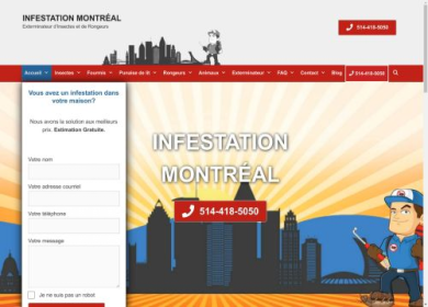 INFESTATION MONTRÉAL est une entreprise dédiée à la gestion parasitaire, offrant des services professionnels d'extermination pour divers types d'infestations. Les techniciens de l'entreprise, certifiés par le Ministère de l’Environnement du Québec, offrent des interventions sécuritaires en utilisant des produits biodégradables. L'entreprise prend en charge une gamme complète de services incluant l'extermination de fourmis charpentières, de souris, de punaises de lit, ainsi que l'installation et la capture d'animaux. INFESTATION MONTRÉAL s'engage à résoudre les problèmes d'infestation de manière efficace et à des prix équitables. Les services de l'entreprise comprennent aussi l'arrosage saisonnier extérieur contre les insectes et le calfeutrage pour prévenir les intrusions de rongeurs et d'insectes.