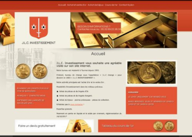 J.L.C INVESTISSEMENT entreprise installée à Tournai, est spécialisée dans le rachat de pièces d or, de bijoux et de pierres précieuses ainsi que dans l achat d'or et expertise gratuite de monnaie. Grâce à son expertise met à votre disposition des cours de l'or que vous soyez aux alentours de Paris et de Lille. Pour plus d'informations, contactez J.L.C INVESTISSEMENT au Tel : 00.32.69.22.38.34.