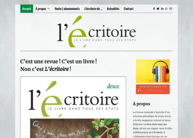 L'Ecritoire est un périodique suisse pensé pour les férus des livres qui rêvent d'explorer de nouveaux horizons. Ses différents articles font la lumière de manière innovante et souvent surprenante l'envers du décors, de l'activité d'éditeur et de la circulation des livres, tout en privilégiant les rencontres amicales entre les diverses formes de la culture d'aujourd'hui, la vie sociale et la littérature. L'Ecritoire est un nouveau magazine consacré à la création littéraire contemporaine en terre suisse romande: il sort de presse tous les six mois et peut s'obtenir chez votre libraire ou chez son éditeur.