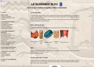 Le Scarabée Bleu est une société de vente par correspondance de cadeaux originaux importés d'Egypte (des scarabées porte bonheur en pierre, des objets en papyrus tels que des affiches ou des marque page, des bijoux), d'Inde (des objets en cuir tels que des sacs, des portefeuilles ou des porte monnaie, de l'encens, des porte encens, des coffrets à bijoux en bois, des animaux en bois sculptés) et de Bali (des objets en bois).