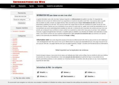 Il est venu le temps pour votre site de prendre son envol sur la toile, pour cela vous êtes en recherche de bons annuaires pour faire la promotion de votre site. L'informations du web sera un partenaire de qualité pour accroître votre notoriété sur le web. Au travers de notre guide vous pourrez présenter votre site ainsi et surtout les pages internes. En effet nous laissons la possibilité de créer plusieurs pages. Vous posséderez une page auteur que vous pourrez améliorer en lui apportant un texte soutenu. Ensuite après vérifications des points de contrôles nous validerons en urgence votre site et/ou pages.