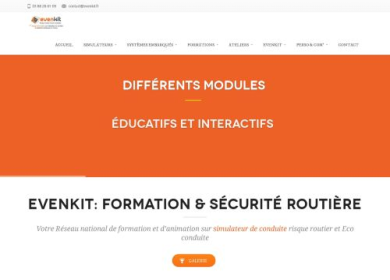 Evenkit : Fournisseur de simulateur de conduite. Location d'appareils simulateur de conduite pour tous types de véhicules : simulateur de conduite d'automobile, simulateur de conduite de motos, simulateur de conduite de poids lourds. Evenkit organise des salons et événements, il vous offre aussi des formations intéressantes par des formateurs agrées, telles que la formation sur le risque routier, la formation sur l'éco conduite, la formation continue en e-learning,et la formation vul spéciale tpe. À part les formations, Evenkit vous propose des ateliers pratiques sur simulation d'accident, sur l'alcool et la drogue, et sur le circuit routier pour enfant. En outre, Evenkit vend aussi des logiciels interactifs sur la sécurité routière, la conduite citoyenne et éco conduite.