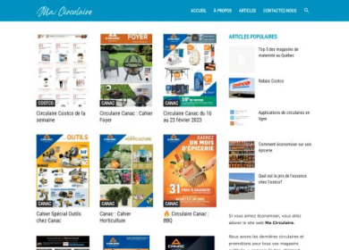 Le site de Macirculaire.com, circulaire des magasins au Québec et à Montréal propose à leurs visiteurs en ligne une large sélection de boutiques et magasins qui annoncent les bonnes affaires et les aubaines dans la région du Québec. Vous pouvez trouver en ligne sur Macirculaire.com les circulaires des épiceries, des magasins d'alimentations, des magasins de produits pour la maison et rénovation, de ne pas oublier aussi des magasins d'électronique et vêtement...