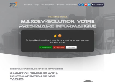 Entreprise de prestations informatiques, MAXDEV-SOLUTION vous accompagne dans tous vos projets pour la création de site internet, de boutiques en ligne, d'infrastructure informatique, de sécurisation de vos données, de développement informatique personnalisé, de référencement sur Internet, ... mais également pour vous aider à optimiser vos procédures et digitaliser votre entreprise ou encore à gérer vos projets informatiques. Fondée par 3 professionnels reconnus et expérimentés de l'informatique aux compétences complémentaires, nous saurons avec vous aborder tous les domaines de l'informatique applicables à vos projets, vos ambitions et votre réussite. MAXDEV-SOLUTION, c'est votre prestataire informatique.