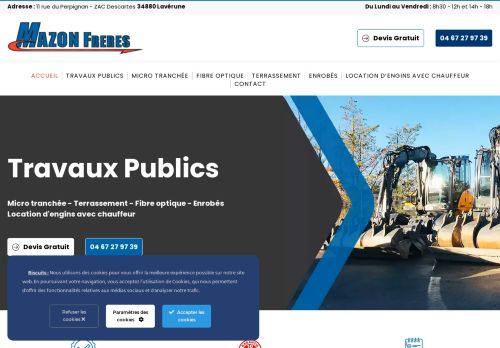 Mazon Frères, entreprise de travaux publics, micro tranchée, tranchée pour fibre optique, terrassement, travaux d'enrobés et location d'engins avec chauffeur dans la vile d'Occitanie et Montpellier. Pour plus d'information, composez le numéro 0467279739 ou visitez notre site officiel https://mazon-freres.com/.
