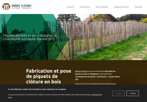 Moraux Clôtures, est une entreprise de fabrication de piquets de clôture et barrière en bois située à Chamboret dans le département de la Haute-Vienne (87), Se déplace également sur La Charente (16) et la Gironde (33) pour l'aménagement de votre jardin fabrication de tuteurs d'arbres, tuteurs à tomates, poteaux d'angle, treillages, croisillons, jambes de force... Pour plus d'informations, appelez au Tel : 05.32.14.08.09.