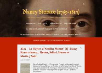Envie d'en savoir plus sur l'opéra au 18e siècle et sur une figure majeure qui a connu Mozart et Salieri, Haydn et Lady Hamilton, et d'autres personnages illustres de son temps ? Approfondissez la biographie de Nancy Storace (de son vrai nom, Ann Selina Storace), une cantatrice star de l'époque des Lumières, avec ce blog compagnon du livre d'Emmanuelle Pesqué "Nancy Storace, muse de Mozart et de Haydn", salué par la critique française à sa parution. Biographies et portraits, images rares, documents d'archives et extraits audio et vidéo vous feront aussi découvrir un répertoire d'opéra peu connu des mélomanes et des lyricomanes.