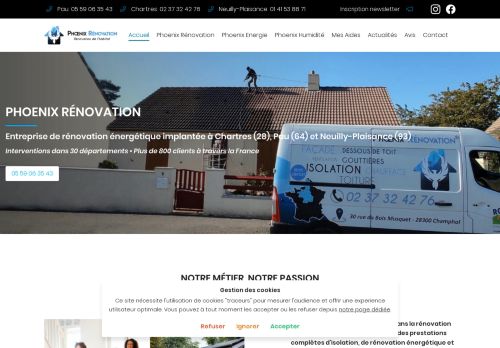 Phoenix Renovation, votre entreprise de rénovation énergétique à Chartres (28), Pau (64), Pantin (93) et intervenant dans 30 départements, vous fit découvrir son nouveau site internet. Vous y découvrez l'ensemble des services de votre entreprise de rénovation de maison : rénovation énergétique, ravalement de façade, rénovation de toiture, isolation des combles, isolation sous toiture, isolation par l'extérieur, pose de pompes à chaleurs, panneaux solaires, traitement des problèmes d'humidité… N'hésitez pas, le devis est gratuit.