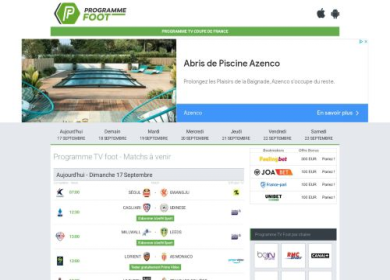 Vous êtes passionné de foot et vous ne voulez rater aucun match ? Vous ne savez pas où trouver un agenda des matchs ? Vous préférez voir les matchs à la télévision, mais sur quelle chaine pouvez-vous les voir ? Ne vous inquiétez plus, car www.programmefoot.com met à votre disposition un agenda télévision des matchs des principales compétitions de football, que cela soit le championnat de France de Ligue 1, de Ligue 2 ou alors de l'Euro. Vous pourrez retrouver les horaires et les chaînes TV diffusant le match de votre choix.