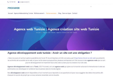 Proxiweb Tunisie est une agence qui propose des solutions web pour améliorer les performances des entreprises: la création de votre site web, son référencement ou sa promotion. nous pouvons vous aider dans toutes les étapes de votre projet. Nous vous proposons des services dans le domaine de Développement front end et back end, Création de sites vitrine, e-commerce, blog, sur-mesure, de création des chartes graphiques, graphism, Marketing Digital.