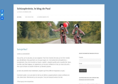 Je suis schizophrène, je m'appelle Paul. La grande majorité des schizophrènes ne sont pas dangereux. Mais il est vrai que notre relation à la réalité est parfois troublée et confuse. J'ai donc créé un blog pour parler de mon quotidien et tordre le cou aux idées reçues. L'isolement et la souffrance sont notre lot quotidien. Venez découvrir comment je vis au jour le jour. Pour aider à mieux faire connaitre la schizophrénie. C'est une maladie qui touche 1% de la population mondiale. Ce blog est donc une tranche de vie, ma vie, celle d'une personne malade. En même temps, parfois il m'arrive de sourire et de voir la vie du bon côté. Mais c'est un dur équilibre entre délires et réalité. Venez voir au jour le jour comment je vis et soyez surpris. J'espère avec ce blog participer au changement pour que nous ne soyons plus stigmatisés comme cela est trop souvent le cas. Encore aujourd'hui, nous devons cacher notre maladie aux autres sous peine de nous retrouver encore plus seuls. Mais le plus important est le lien que je tisse jours après jours avec les visiteurs. J'ai même été interviewé par un journal sur internet qui a été intéressé par ma démarche. Mon blog est donc un rendez-vous pour toutes les personnes curieuses, dans le bon sens du terme sur tout ce qui touche à la souffrance psychique et plus particulièrement à la schizophrénie. Je parle de mes relations avec les autres, de mes souffrances. Je pense avoir le recul nécessaire pour parler de ce trouble mais je ne suis ni médecin ni thérapeute. De plus chaque lecteur peut répondre et parler de sa propre expérience, ce site est ouvert à toutes et tous, malade ou non. Je reste cependant anonyme étant donné le traitement médiatique dont nous sommes victimes.