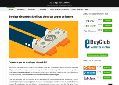 Les sondages rémunérés sont des sondages payants qui consistent à donner des réponses à plusieurs questions en échange d'une récompense qui varie selon l'institut qui propose le sondage. À travers le site sondage-remuneres.fr, vous découvrirez le fonctionnement et l'importance des sondages rémunérés dont l'argent est la rémunération la plus commune. De plus, toutes les précautions que vous devez adopter afin de ne pas tomber dans les pièges des faux sites qui proposent des sondages payants sont présentées sur ce site. En outre, le top des cinq des meilleurs sites de sondages rémunérés les plus préférés par les internautes est présenté sur ce site qui permet aussi d'accéder au meilleur comparatif des sites de sondages rémunérés.