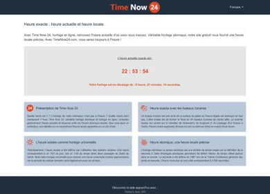 Quel heure est il ? Quelle heure est il maintenant ? Time Now 24 est une horloge en ligne qui permet de consulter gratuitement l'heure actuelle et locale. Vous disposez depuis un ordinateur, une tablette ou un smartphone de l'heure atomique exacte.