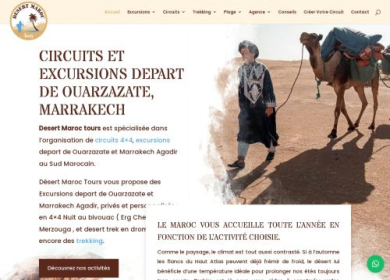 Avec Desert Maroc Tours , c'est partir à une découverte original d'un Maroc des hommes bleu. D'emblée, l'aventure commence à Marrakech, Essaouira, Casablanca, Fès, Agadir, Ouarzazate et finalement M'hamid El Ghizelane. Avec des guides douées parlant Anglais, Français, et Arabe, et Spécialisées dans les Safaris